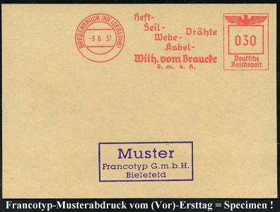 10748 | 35 € | PL-Raum 58 : BREDENBRUCH (KR ISERLOHN)/ Heft-/ Seil-/ Webe-/ Kabel-/ Drähte/ Wilh.vom Braucke.. 1937 (9.6.) AFS-Musterabdruck Francotyp "Reichsadler" , glasklar gest. Francotyp-Musterblatt vom (Vor)-Ersttag !, selten! (Dü.E-5CGo) | ![]() ![]() | |
