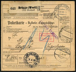 10750 | 28 € | PL-Raum 58 : BRÜGGE (WESTF)/ a 1939 (29.9.) 2K-Steg + schw. Selbstbucher-Paketzettel: Brügge (Westf)/ Otto Eichhoff + roter Ra.: Gebühr/ bezahlt + 1K-Brücke u. Leitzettel: Villach 2 etc., Ausl.-Selbstbucher-Paketkarte n. Zagreb, rs. jugoslaw. Tax- u. Fiskalmarken | ![]() ![]() | |