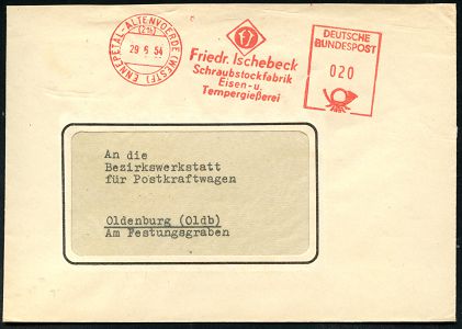 10756 | 15 € | PL-Raum 58 : (21b) ENNEPETAL-ALTENVOERDE (WESTF)/ Friedr.Ischebeck/ Schraubstockfabrik/ Eisen-u./ Tempergießerei 1954 (29.5.) AFS Postalia (Monogr.-Logo) Fern-Bf. (Dü.E-23B) | ![]() | |