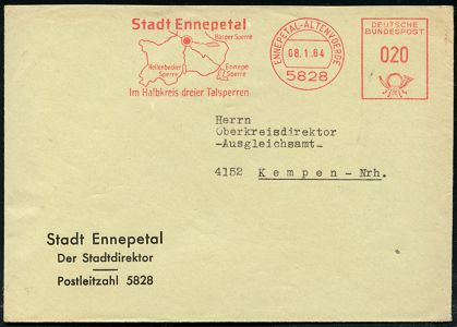 10758 | 12 € | PL-Raum 58 : 5828 ENNEPETAL-ALTENVOERDE/ (WESTF)/ ..Im Halbkreis dreier Talsperren 1964 (8.1.) AFS (Landkarte m. 3 Talsperren) klar gest. Kommunalbf. (Dü.E-23CG) | ![]() | |