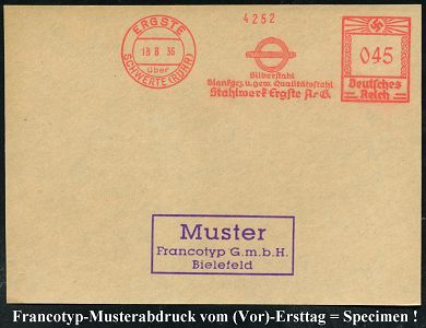 10761 | 35 € | PL-Raum 58 : ERGSTE/ über/ SCHWERTE (RUHR)/ Silberstahl/ ..Stahlwerk Ergste A.-G. 1936 (18.8.) AFS-Musterabdruck Francotyp "Hakenkreuz" = PSt. I-Typ (Firmen-Logo) glasklar gest. Francotyp-Musterblatt vom (Vor)-Ersttag !, selten!, vergl. Kat.-Nr. 10762 (Dü.E-3CEh) | ![]() ![]() | |