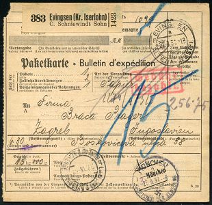 10763 | 25 € | PL-Raum 58 : EVINGSEN/ über/ ALTENA (WESTF)/ a 1937 (22.9.) 2K-Steg + roter Ra.2: Gebühr/bezahlt + schw. Selbstbucher-Paketzettel: Evingsen (Kr. Iserlohn)/ C. Schniewindt Sohn , 1K + Leitzettel: München etc., Ausl.-Selbstbucher-Paketkarte (kl. Eckfehler) n. Zagreb, rs. jugoslaw. Tax- u. Fiskalmarken | ![]() ![]() | |