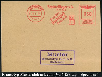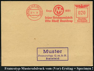 10773 | 35 € | PL-Raum 58 : GRÜNE (KR ISERLOHN)/ Gegr. 1851/ Grüner Metallwarenfabrik/ Otto Adolf Oventrop 1938 (22.4.) AFS-Musterabdruck Francotyp "Reichsadler" (Monogr.-Logo) glasklar gest. Francotyp-Musterblatt vom (Vor)-Ersttag !, selten! (Dü.E-5CGo) | ![]() ![]() | |