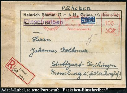 10774 | 25 € | PL-Raum 58 : GRÜNE/ (KR.ISERLOHN)/ Heinrich Stamm/ GmbH/ Metall-Grob-u./ Feindrahtwerke 1949 (3.12.) AFS Francotyp "Posthorn" 100 Pf. auf 2 Pf. NoB (= Vorausentwertung) + R-Zettel: (21 b) Letmathe, nachgezettelt !, Einschreib-Adreß-Label: Heinr. Stamm (schwach fleckig) rs. AS.!,, sehr seltene Portostufe! (Dü.E-20CEo) | ![]() | |