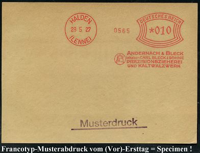 10775 | 35 € | PL-Raum 58 : HALDEN/ (LENNE)/ ANDERNACH & BLECK/ ..PRÄZISIONSZIEHEREI/ UND KALTWALZWERK 1927 (28.5.) AFS-Musterabdruck Francotyp "Bogenrechteck" (Monogr.-Logo) glasklar gest. Francotyp-Musterblatt vom (Vor)-Ersttag !, selten! (Dü.E-1Am) | ![]() ![]() | |