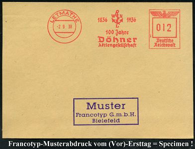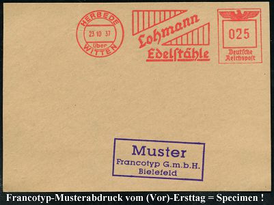 10780 | 35 € | PL-Raum 58 : HERBEDE/ über/ WITTEN/ Lohmann/ Edelstähle 1937 (23.10.) AFS-Musterabdruck Francotyp "Reichsadler", PSt.I-Typ (2 Dreiecke) glasklar gest. Francotyp-Musterblatt vom (Vor)-Ersttag !, selten! (Dü.E-5CGo) | ![]() ![]() | |