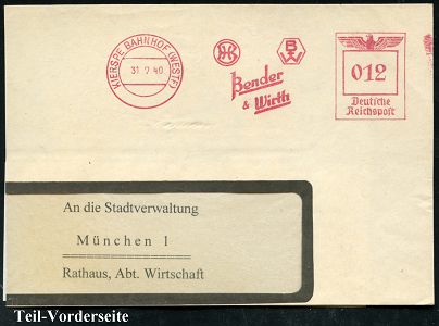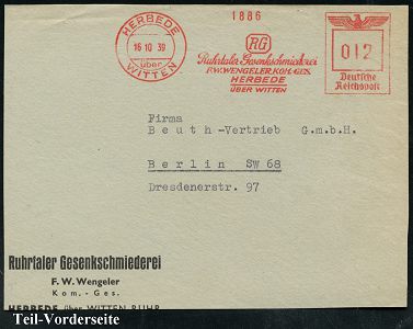 10781 | 15 € | PL-Raum 58 : HERBEDE/ über/ WITTEN/ RG/ Ruhrtaler Gesenkschmiedere/ F.W.WENGELERi.. 1939 (16.10.) AFS Francotyp "Reichsadler" = PSt. I-Typ (Monogr.-Logo) Bedarfs-Vorderseite, vergl. Kat.-Nr. 10779 (Dü.E-5CGh) | ![]() | |