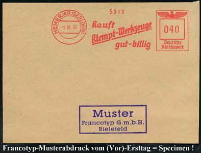 10782 | 35 € | PL-Raum 58 : HEMER (KR ISERLOHN)/ Kauft/ Klempf-Werkzeuge/ gut-billig 1937 (1.12.) AFS-Musterabdruck Francotyp "Reichsadler" , glasklar gest. Francotyp-Musterblatt vom (Vor)-Ersttag !, selten! (Dü.E-5CGh) | ![]() ![]() | |