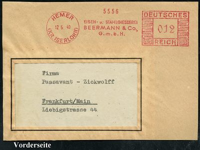 10784 | 12 € | PL-Raum 58 : HEMER/ (KR.ISERLOHN)/ EISEN-u.STAHLGIESSEREI/ BEERMANN & Co.. 1940 (12.9.) AFS Francotyp "Mäanderrechteck" auf kleiner Bedarfs-Vorderseite (Dü.E-2CEh) | ![]() | |