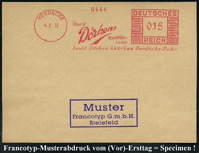 10793 | 35 € | PL-Raum 58 : HERDECKE/ Überall/ Dörkens/ Qualitäts-/ Lacke/ Ewald Dörken.. 1932 (4.2.) AFS-Musterabdruck Francotyp "Mäanderrechteck" , glasklar gest. Francotyp-Musterblatt vom (Vor)-Ersttag !, selten!, vergl. Kat.-Nr. 10795 (Dü.E-2CEh) | ![]() ![]() | |