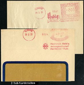 10794 | 18 € | PL-Raum 58 : HERDECKE/ Heinrich Habig/ AG.. 1933/36 2 verschiedene AFS Francotyp "Bogenrechteck" bzw. "Mäanderrechteck" (1x Jubil.-AFS: "125 JAHRE.." = Stoff-Druckerei) je auf Teil-Vorderseite, 2 Belege, vergl. Kat.-Nr. 10797 (Dü.E-1Am, E-2Am) | ![]() | |