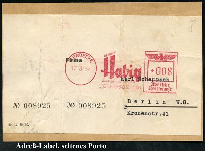 10797 | 20 € | PL-Raum 58 : HERDECKE(HEINRICH/ Habig/ AG/ STOFFDRUCKEREI SEIT 1809 1937 (17.3.) AFS Francotyp "Reichsadler" 008 Pf. auf Adreß-Label (natürliche Falte) n. Berlin, seltene Portostufe! (Dü.E-5AGo = seltene Type) | ![]() | |