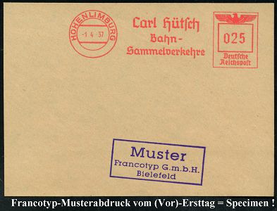 10803 | 35 € | PL-Raum 58 : HOHENLIMBURG/ Carl Hütsch/ Bahn-/ Sammeltransporte 1937 (1.4.) AFS-Musterabdruck Francotyp "Reichsadler" , glasklar gest. Francotyp-Musterblatt vom (Vor)-Ersttag !, selten! (Dü.E-5CGo) | ![]() ![]() | |