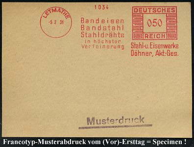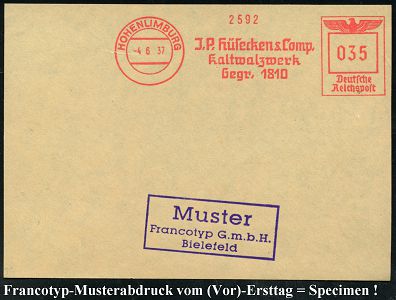10805 | 35 € | PL-Raum 58 : HOHENLIMBURG/ J.P.Hüfecken & Comp./ Kaltwalzwerk/ Gegr,1810 1937 (4.6.) AFS-Musterabdruck Francotyp "Reichsadler" , glasklar gest. Francotyp-Musterblatt vom (Vor)-Ersttag !, selten! (Dü.E-5CGh) | ![]() ![]() | |