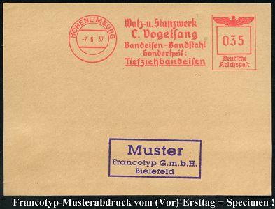 10806 | 35 € | PL-Raum 58 : HOHENLIMBURG/ Walz-u.Stanzwerk/ C.Vogelsang/ Bandeisen-Bandstahl/ Sonderheit:/ Tiefziehbandeisen 1937 (7.6.) AFS-Musterabdruck Francotyp "Reichsadler" , glasklar gest. Francotyp-Musterblatt vom (Vor)-Ersttag !, selten! (Dü.E-5CGo) | ![]() ![]() | |