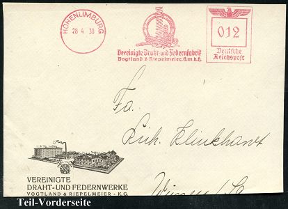 10808 | 16 € | PL-Raum 58 : HOHENLIMBURG/ Vereinigte Draht-u.Federnfabrik/ Vogtland & Riepelmeiser.. 1938 (28.4.) AFS Francotyp "Reichsadler" (diverse Metall-Ferden) Bedarfs-Vorderseite mit Werks-Abb. (Dü.E-5CEo) | ![]() | |