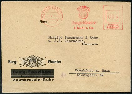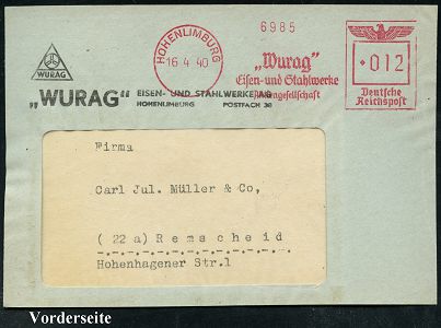 10813 | 14 € | PL-Raum 58 : HOHENLIMBURG/ "Wurag"/ Eisen-u.Stahlwerke/ AG 1940 (16.4.) AFS Francotyp "Reichsadler" auf Firmen-Vorderseite mit Logo (Dü.E-5DGh) | ![]() | |