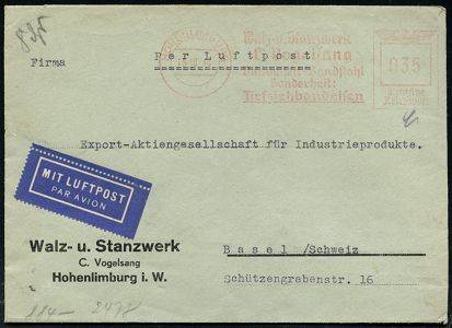 10815 | 35 € | PL-Raum 58 : HOHENLIMBURG/ Walz-u.Stanzwerk/ C.Vogelsang/ Bandeisen-Bandstahl/ Sonderheit:/ Tiefziehbandeisen 1940 (5.10.) AFS Francotyp "Reichsadler" 035 Pf. + rs. OKW-Zensurstreifen "Geöffnet, e" + schw. Band-Zensurstpl. "Geprüft".. (= Ffm., Rie.E-20, E-53, zus. + 60 Pkte.) Ausl.-Firmen-Flug-Zensur-Bf. (rs. kl. Klappenriß geschl.) n. Basel, seltenes Porto! (Dü.E-5CGo) | ![]() ![]() | |