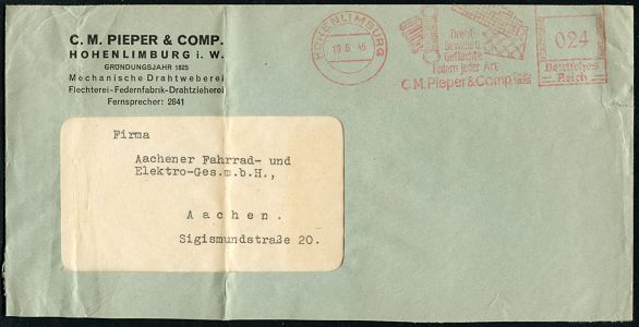 10818 | 20 € | PL-Raum 58 : HOHENLIMBURG/ Draht-/ Gewebe u./ Geflechte/ Federn jeder Art/ C.M.Pieper & Comp. 1946 (19.5.) seltener, aptierter AFS Francotyp "Hakenkreuz" = entfernt = Notmaßnhme! (div. Drahtgeflechte u. federn) Firmen-Bf. (links gefaltet, rechts kl. Riß geschl.) n. Aachen (Dü.E-12 K-98o) | ![]() | |