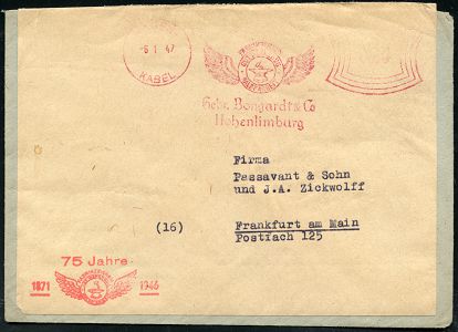 10820 | 30 € | PL-Raum 58 : Hohenlimburg 1947 (6.1.) aptierter AFS Francotyp "Bogenrechteck": HAGEN-/KABEL/Gebr. Bongardt & Co/Hohenlimburg (geflügeltes Firmenlogo mit Amboß u. Hammer + motivgl. Firmen-Jubil.-HdN: 75 Jahre, 1871 1946.., rs. ovaler Abs.-HdN: GEBR. BONGARDT & Co., Gußstahlfabrik.., doppelt verwendeter Recycling-Fern-Bf. (Dü.E-10 H-57CE) | ![]() ![]() | |
