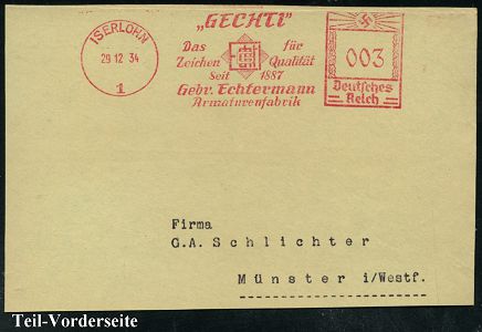 10827 | 14 € | PL-Raum 58 : ISERLOHN/ 1/ "GECHTI"/ ..Seit 1887/ Gebr.Echtermann/ Armaturenfabrik 1934 (29.12.) AFS Francotyp "Hakenkreuz" (Firmen-Logo) klar gest. Teil-Vorderseite (Dü.E-3CEo) | ![]() | |