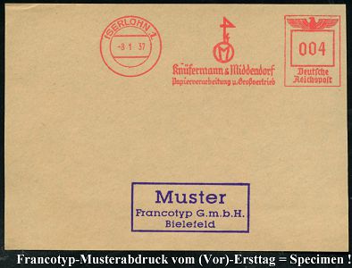 10828 | 35 € | PL-Raum 58 : ISERLOHN 1/ Knüfermann & Middendorf/ Papierverarbeitung u.Großvertrieb 1937 (8.1.) AFS-Musterabdruck Francotyp "Reichsadler" (Monogr.-Logo) glasklar gest. Francotyp.Musterblatt vom (Vor)-Ersttag !, selten! (Dü.E-5CGo) | ![]() ![]() | |