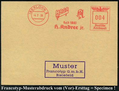10831 | 35 € | PL-Raum 58 : ISERLOHN 1/ HAGA/ HA/ Seit 1863/ H.Andree jr. 1939 (4.7.) AFS-Musterabdruck Francotyp "Reichsadler" (2x Monogr.-Logo) glasklar gest. Francotyp-Musterblatt vom (Vor)-Ersttag !, selten! (Dü.E-5CGo) | ![]() ![]() | |