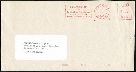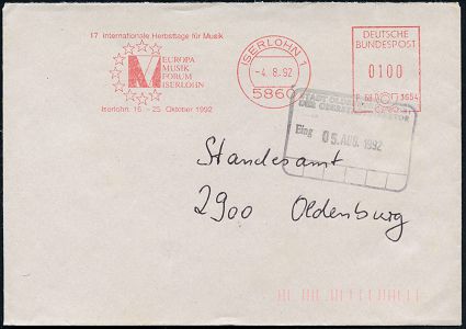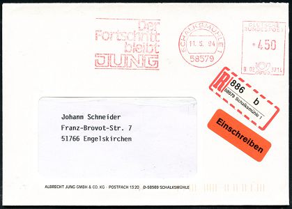 10923 | 15 € | PL-Raum 58 : 58579 SCHALKSMÜHLE 1/ B 02 3714/ Der/ Fortschritt/ bleibt/ JUNG 1994 (11.5.) AFS Francotyp mit Kennung u. stilis. Posthorn, 450 Pf. + Selbstklebe-RZ-_ 58579 Schalksmühle 1/b , codierter Fern-R-Bf.: ALBRECHT JUNG GMBH.. (Dü.E-26) | ![]() | |