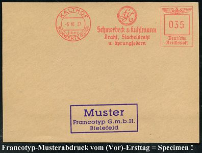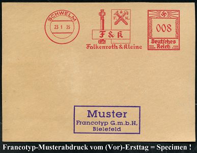 10925 | 35 € | PL-Raum 58 : SCHWELM/ F & K/ Falkenroth & Kleine 1935 (23.1.) AFS-Musterabdruck Francotyp "Hakenkreuz" (Schrauben-Logo u. Schraube mit Mutter) glasklar gest. Francotyp-Musterblatt vom (Vor)-Ersttag !, selten!, vergl. Kat.-Nr. 10934 (Dü.E-3CEo) | ![]() ![]() | |