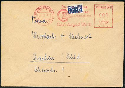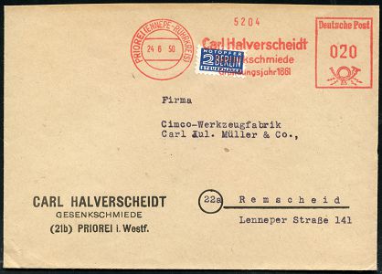 10916 | 16 € | PL-Raum 58 : PRIOREI (ENNEPE-RUHRKREIS)/ Carl Halverscheidt/ Gesenkschmiede.. 1950 (24.6.) AFS Francotyp "Posthorn" mit alter Zählnr. auf gez. 2 Pf. NoB (= Vorausentwertung) klar gest. Firmen-Bf. (Dü.E-20CGh) | ![]() | |