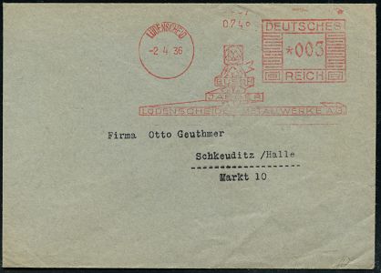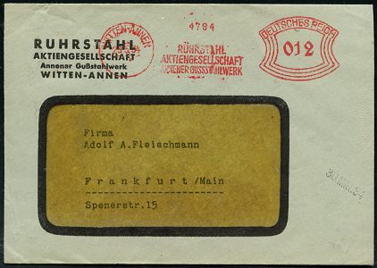 10964 | 22 € | PL-Raum 58 : WITTEN-ANNEN/ RUHRSTAHL/ AG/ ANNENER GUSSSTAHLWERK 1934 (29.5.) AFS Francotyp "Bogenrechteck" auf Firmen-Fern-Bf. (Dü.E-1BAh) | ![]() | |