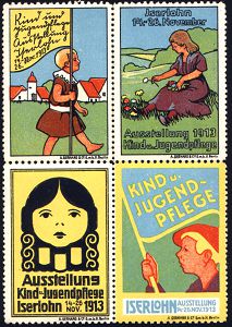10822 | 25 € | PL-Raum 58 : Iserlohn 1913 (Nov.) 4 verschied. Color-Vign.: Ausstellung Kind- u. Jugendpflege als Zusammendruck-4er-Block (4 Stück), orig.G. | ![]() | |