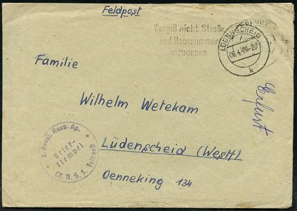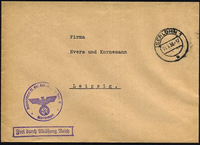 10830 | 15 € | PL-Raum 58 : ISERLOHN 1/ e 1939 (19.3.) 2K-Steg + viol. 1K-HdN: Zahlmeisterei IV. Abt. Kav.-Schwadron Regt.4 (oben gering undeutl.) + Ra.: FdAR , Wehrmachts-Dienst-Bf. n. Leipzig | ![]() | |