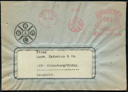 10881 | 25 € | PL-Raum 58 : LÜDENSCHEID/ ..W.Brauckmann & Rahmede 1946 (18.9.) AFS Francotyp "Bogenrechteck" u n v e r ä n d e r t weiterverwendet mit Inschrift "DEUTSCHES REICH" = Notmaßnahme! (Firmen-Monogr.-Logo mit 4 Schrauben) motivgl. Firmen-Fern-Bf. (Dü.E-1CAh, unverändert) | ![]() | |