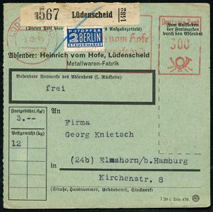 10887 | 25 € | PL-Raum 58 : LÜDENSCHEID/ Heinrich vom Hofe/ Metallwarenfabrik 1949 (9.12.) AFS Francotyp "Posthorn" 300 Pf. auf 2 Pf. NoB + schw. Paketzettel: Lüdenscheid , grüne Inl.-Paketgut-Paketkarte n. Elmshorn, seltene Portostufe! (Dü.E-20CG) | ![]() | |