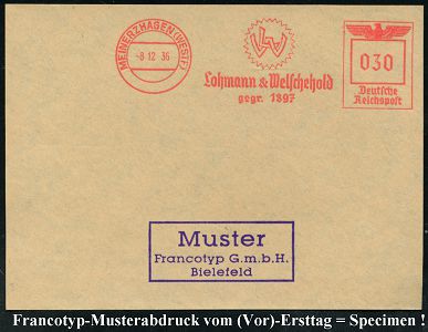 10899 | 35 € | PL-Raum 58 : MEINERZHAGEN (WESTF)/ LW/ Lohmann & Welschehold/ gegr.1897 1936 (8.12.) AFS-Musterabdruck Francotyp "Reichsadler" (Monogr.-Logo mit Zahnrad) glasklar gest. Francotyp-Musterblatt vom (Vor)-Ersttag !, selten! (Dü.E-5CGo) | ![]() ![]() | |