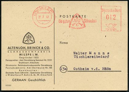 10906 | 18 € | PL-Raum 58 : (21b) MILSPE/ Die guten ABC Schrauben 1947 (31.7.) AFS Francotyp "Posthorn" (Firmen-Logo mit 3 Schrauben) auf motivgl. Firmen-Kt. mit Text über Materialmange!, vergl. Kat.-Nr.10904 (Dü.E-20CGo) | ![]() ![]() | |