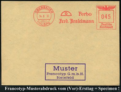 10907 | 35 € | PL-Raum 58 : OBERBAUER/ über/ MILSPE/ Ferbo/ Ferd.Braselmann 1937 (14.6.) AFS-Musterabdruck Francotyp "Reichsadler" (Firmen-Logo) glasklar gest. Francotyp-Musterblatt vom (Vor)-Ersttag !, selten! (Dü.E-5CGo) | ![]() ![]() | |