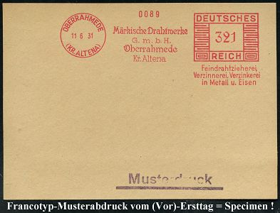 10910 | 35 € | PL-Raum 58 : OBERRAHMEDE/ (KR.ALTENA)/ Märkische Drahtwerke../ Feindrahtzieherei/ Verzinnerei,Verzinkerei/ in Metall u.Eisen 1931 (11.6.) AFS-Musterabdruck Francotyp "Mäanderrechteck" , glasklar gest. Francotyp-Musterblatt vom (Vor)-Ersttag !, selten!, vergl. Kat.-Nr. 10913 (Dü.E-2CEh) | ![]() ![]() | |