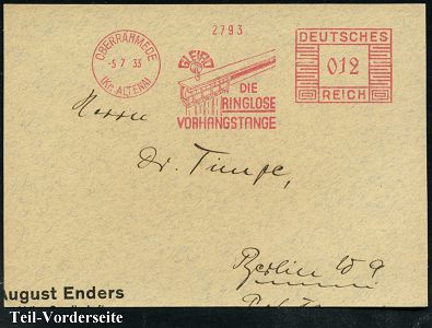 10911 | 15 € | PL-Raum 58 : OBERRAHMEDE/ (Kr.ALTENA)/ GLEIRO/ IE/ RINGLOSE/ VORHANGSTANGE 1933 (5.7.) AFS Francotyp "Mäanderrechteck" (Motiv: Vorhangstange mit Roll-System) klar gest. Teil-Vorderseite: August Enders. seltenes Motiv! (Dü.E-2CEh) | ![]() | |