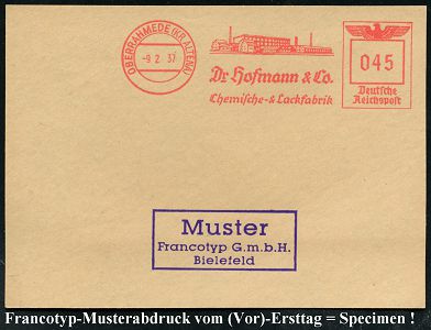 10912 | 35 € | PL-Raum 58 : OBERRAHMEDE (KR ALTENA)/ Dr Hofmann & Co./ Chemische- & Lackfabrik 1937 (9.2.) AFS-Musterabdruck Francotyp "Reichsadler" (Fabrik-Anlage) glasklar gest. Francotyp-Musterblatt vom (Vor)-Ersttag !, selten! (Dü.E-5CGo) | ![]() ![]() | |
