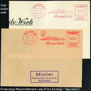 10927 | 40 € | PL-Raum 58 : SCHWELM/ RW/ Rondo-Werk 1937/40 AFS-Musterabdruck Francotyp "Reichsadler" (Monogr.-Logo, moderne Fabrik) glasklar gest. Musterblatt vom (Vor)-Ersttag ! = selten! + gl. AFS o h n e Monogramm-Logo auf Teil-Vorderseite, 2 Belege in Entwicklungs-Darstellung, = Fa. Berning & Co., Hersteller von Wasch- u. Wringmaschinen (Dü.E-5CGo) | ![]() ![]() | |
