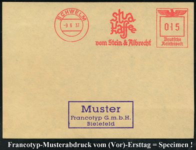 10928 | 35 € | PL-Raum 58 : SCHWELM/ Stra/ Kaffee/ vom Stein & Albrecht 1937 (9.6.) AFS-Musterabdruck Francotyp "Reichsadler" , glasklar gest. Francotyp-Musterblatt vom (Vor)-Ersttag !, selten! (Dü.E-5CGo) | ![]() ![]() | |