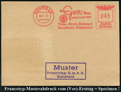 10929 | 35 € | PL-Raum 58 : SCHWELM/ Wiegand Geitz Wwe./ ..Press-Stanz-Ziehwerk/ Kunstharz-Presswerk 1937 (10.11.) AFS-Musterabdruck Francotyp "Reichsadler" (Monogr.-Logo) glasklar gest. Francotyp-Musterblatt vom (Vor)-Ersttag !, selten! (Dü.E-5CGo) | ![]() ![]() | |