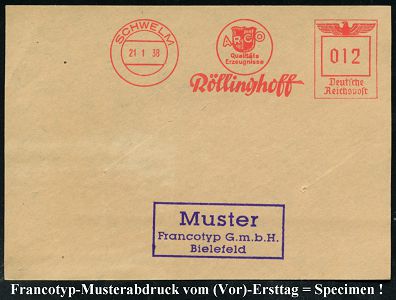 10930 | 35 € | PL-Raum 58 : SCHWELM/ ARCO../ Röllinghoff 1938 (21.1.) AFS-Musterabdruck Francotyp "Reichsadler" (Firmen-Wappen = Bänder- u. Litzen-Fabrik) glasklar gest. Francotyp-Musterblatt vom (Vor)-Ersttag !, selten!, vergl. Kat.-Nr. 10924 (Dü.E-5CGo) | ![]() ![]() | |