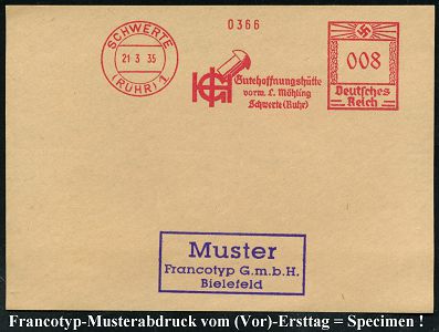 10944 | 35 € | PL-Raum 58 : SCHWERTE/ (RUHR) 1/ GH/ Gutehoffnungshütte/ vorm.L.Möhling.. 1935 (21.3.) AFS-Musterabdruck Francotyp "Hakenkreuz" (Monogr.-Logo u. Metallbolzen) glasklar gest. Francotyp-Musterblatt vom (Vor)-Ersttag !, selten! (Dü.E-3CEh) | ![]() ![]() | |