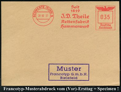 10946 | 35 € | PL-Raum 58 : SCHWERTE (RUHR) 1/ Seite 1819/ J.D.Theile/ Kettenfabrik/ Hammerwerk 1937 (31.10.) AFS-Musterabdruck Francotyp "Reichsadler" , glasklar gest. Francotyp-Musterblatt vom (Vor)-Ersttag !, selten! (Dü.E-5CGo) | ![]() ![]() | |