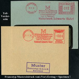 10947 | 35 € | PL-Raum 58 : SCHWERTE (RUHR) 1/ F.W. & J./ Weltbekannte Qualitätsmarke/ für Nickel,Nickellegierungen/ u.Schweissplattierungen../ Nickelwerk Schwerte.. 1939 (21.6.) AFS-Musterabdruck Francotyp "Reichsadler" (Pfeil-Monogr.-Logo) glasklar gest. Francotyp-Musterblatt vom (Vor)-Ersttag !, selten!, vergl. Kat.-Nr. 10945, 10948 (Dü.E-5DGo) | ![]() ![]() | |
