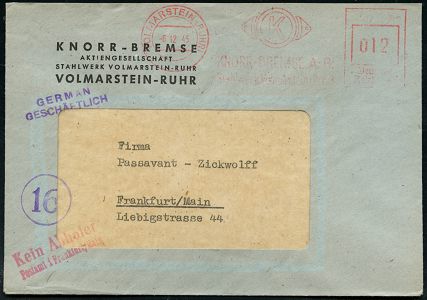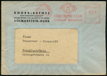 10950 | 20 € | PL-Raum 58 : (21b) VOLMARSTEIN (RUHR)/ K/ KNORR-BREMSE GMBH/ Stahlwerl Volmarstein 1946 (14.9.) seltener AFS Francotyp "Hochrechteck" (Firmenlogo mit stilis. Bremsbacken) Firmen-Fern-Bf. (Dü.E-18CG , nur 1 1/2 Jahre verwendet!) | ![]() | |