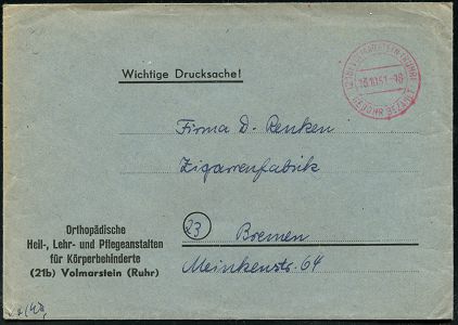 10952 | 12 € | PL-Raum 58 : (21b) VOLMARSTEIN (RUHR)/ GEBÜHR BEZAHLT 1951 (13.10.) violeter 2K-PFS mit Uhrzeit auf Firmen-Bf.: Orthopädische Heil-, Lehr- u. Pflegeanstalten für Körperbehinderten.. (Dü.A-7, Nr.28) | ![]() | |